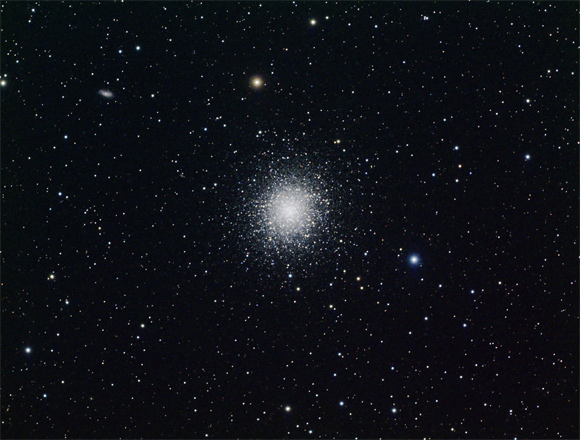 Discovered by Halley in 1714, this globular cluster contains about 600,000 solar masses and is about 13 billion years old. It orbits our Galaxy, taking about one half billion years to make one revolution. The faint galaxy at the upper left is NGC 6207, which is 55 million light years distant. |
