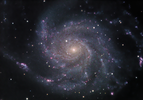 | Description: | M 101 is an asymmetric spiral galaxy because its core is displaced from the center of its disk. Halton Arp called it a "Spiral with One Heavy Arm". The Chandra orbiting, X-Ray Observatory has recently found a possible new class of x-ray sources in M 101. These could be intermediate-sized black holes. Click here to see a widefield view of M 101 on this website. |