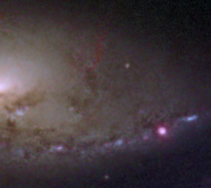 The following image is a full size crop near the galaxy core showing the red shock wave produced by one of this galaxy's bipolar jets. This jet has run into some hydrogen gas in the galaxy and has caused it to glow red.
