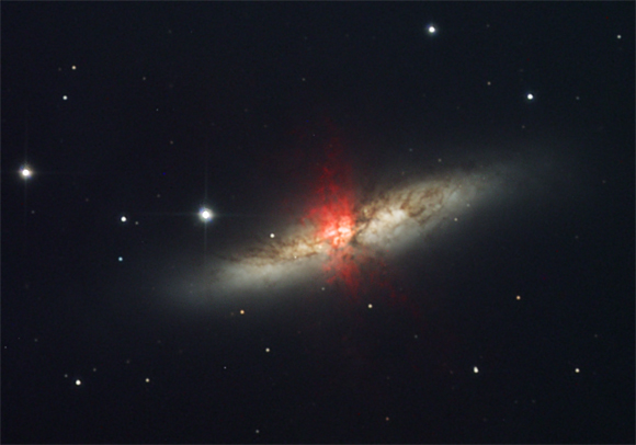 M82 is undergoing intense star formation in its core. This is most likely the result of an interaction with nearby M81. This encounter has caused pockets of gas to collapse into stars. Super novae in the core are responsible for the two red jets of material being blown out of the core. |