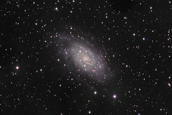 This spiral galaxy is part of the M 81 group. It has a small central nucleus and prominent HII regions (the pink areas in the above image). Although NGC 2403 is known as an 'effervescent' galaxy because it has a lot of active star formation, it was the site of a spectacular death of a star in 2004. This supernova was the closest and brightest in over a decade. |