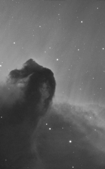This popular, dark nebula, known as 'The Horse Head Nebula', has reached iconic status. It was first detected photographically in 1889 at the Harvard College Observatory. Its Barnard catalogue designation is B 33, and it is mainly composed of dust and compressed, nonluminous gas. It is 3 light years in height. The bright nebula background, IC434, is lit by the star Sigma Orionis (off frame to the top). The 'streamers' visible in IC434 are due to material flowing in a strong magnetic field. |
