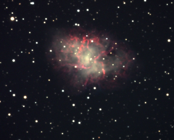 This is the remnant of a supernova that exploded in 1054 A.D. and is nicknamed the "Crab Nebula." At its center is a pulsar that rotates 30 times per second. |