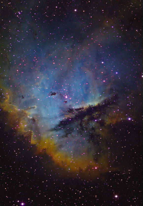 This emission nebula is known as 'The Pacman Nebula'. It is a large, ionized hydrogen cloud that is made visible by the radiation from the young, hot stars within the central, open cluster ( IC 1590). The brightest 'star' in this cluster is responsible for most of the ionizing radiation and is actually a quadruple star. We can make out three of these stars in the above image. Also visible are some Bok Globules, which are the small, dark features composed of gas and dust.